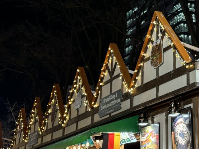 ホットワインやスープといった温かなフード、ドイツの工芸品やクリスマス雑貨のショップが並び、